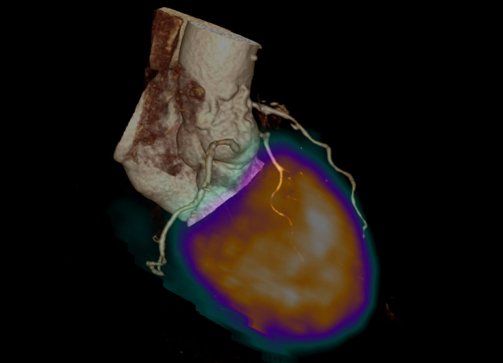 Der PET-Teil dient der Erfassung von funktionellen Prozessen im Körper, im Rahmen der Herz-Untersuchung zur Erfassung der Durchblutung des linken Herzmuskels. Für diesen Untersuchungsteil wird ein sogenanntes “Radiopharmakon” (oder “Tracer“) in eine Vene appliziert, welches mit dem Blut in den Herzmuskel gelangt und sich dort anreichert. Damit das Radiopharmakon (Rubidium-82) bzw. dessen Verteilung im Herz von aussen detektiert werden kann, ist es schwach radioaktiv (Positronen-Emitter). Die ausgesendete Strahlung wird durch einen PET-Scanner detektiert und durch Computer-gestützte Auswertungen in Bilddaten umgerechnet.